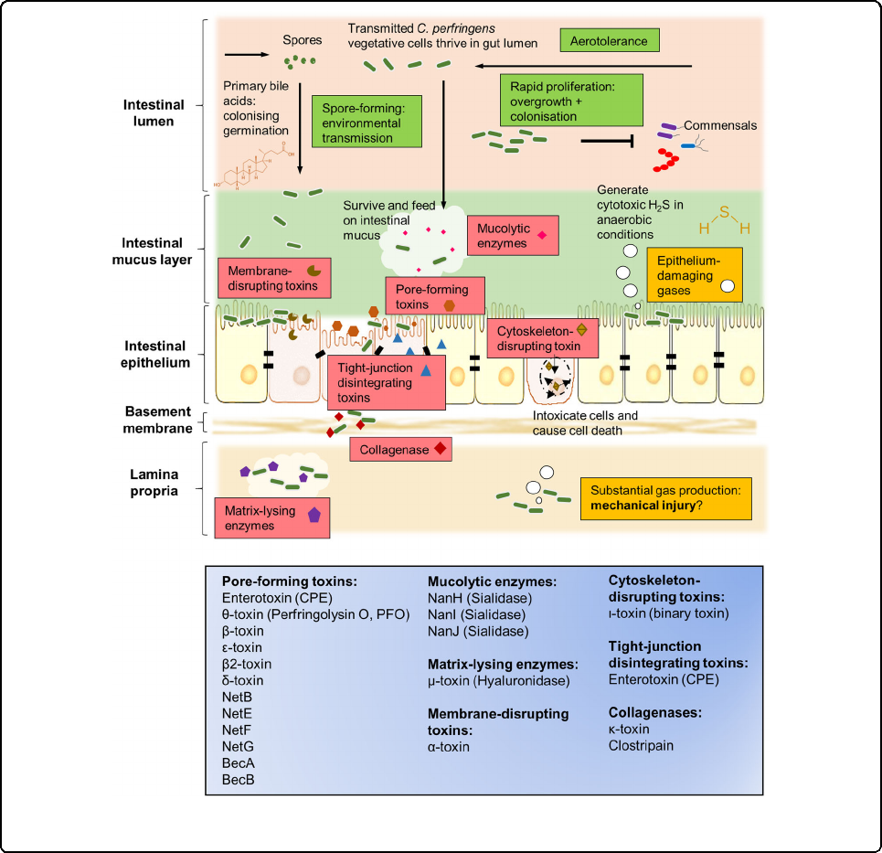 ■ 產(chǎn)氣莢膜梭菌能產(chǎn)生多種毒力因子(包括毒素和水解酶類),使其能快速生長(zhǎng)、耐有氧環(huán)境、產(chǎn)生具有細(xì)胞毒性的硫化氫氣體,引起宿主組織和腸道毒性感染、氣性壞疽、腸毒血癥等疾病。