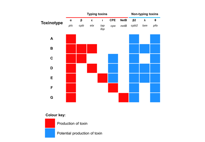 - 根據(jù)其產(chǎn)生的主要致病毒素種類(α、β、ε 、ι、θ、CPE、NetB),可將產(chǎn)氣莢膜梭菌分為A~G 7個(gè)類型。(注:“次要”毒素并不是指這些毒素的重要性或產(chǎn)生水平“次要”,而是指它們不屬于毒素分型體系)