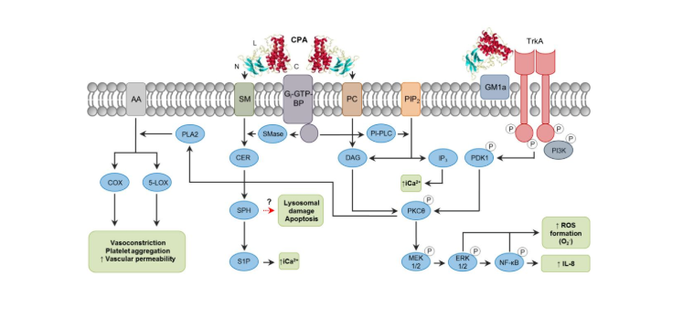 ③CPA中央環(huán)區(qū)域上的神經(jīng)節(jié)苷脂結(jié)合位點(diǎn)與細(xì)胞膜上的激活原肌球蛋白受體激酶A(TrkA)相互作用,使PDK1和PKCθ磷酸化,激活MEK/ERK信號(hào)傳導(dǎo)和NF-κB,形成活性氧(ROS)引起細(xì)胞氧化應(yīng)激、激活細(xì)胞凋亡機(jī)制,促進(jìn)IL-8分泌,促進(jìn)炎癥發(fā)生。