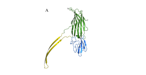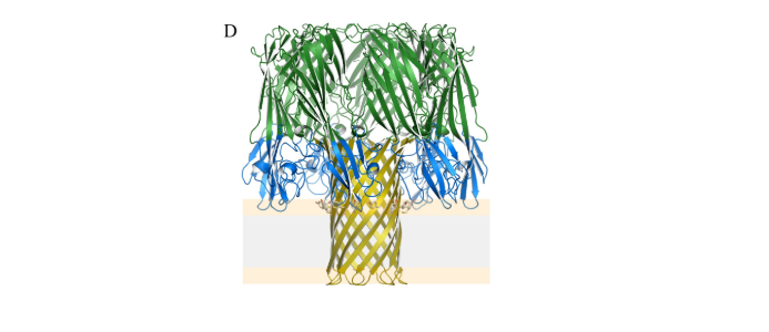 - NetB 單體約為0.18nm,包含3個(gè)主要結(jié)構(gòu)域,如圖示A:①β-sandwich:綠色,與單體寡聚化有關(guān);②stem:黃色,疏水跨膜結(jié)構(gòu),插入細(xì)胞膜;③rim:藍(lán)色,與細(xì)胞膜結(jié)合,參與毒素滲透進(jìn)入細(xì)胞膜;相較于其他β-PFT,缺失4個(gè)氨基酸,推測(cè)其在細(xì)胞膜上的受體與其他不同。