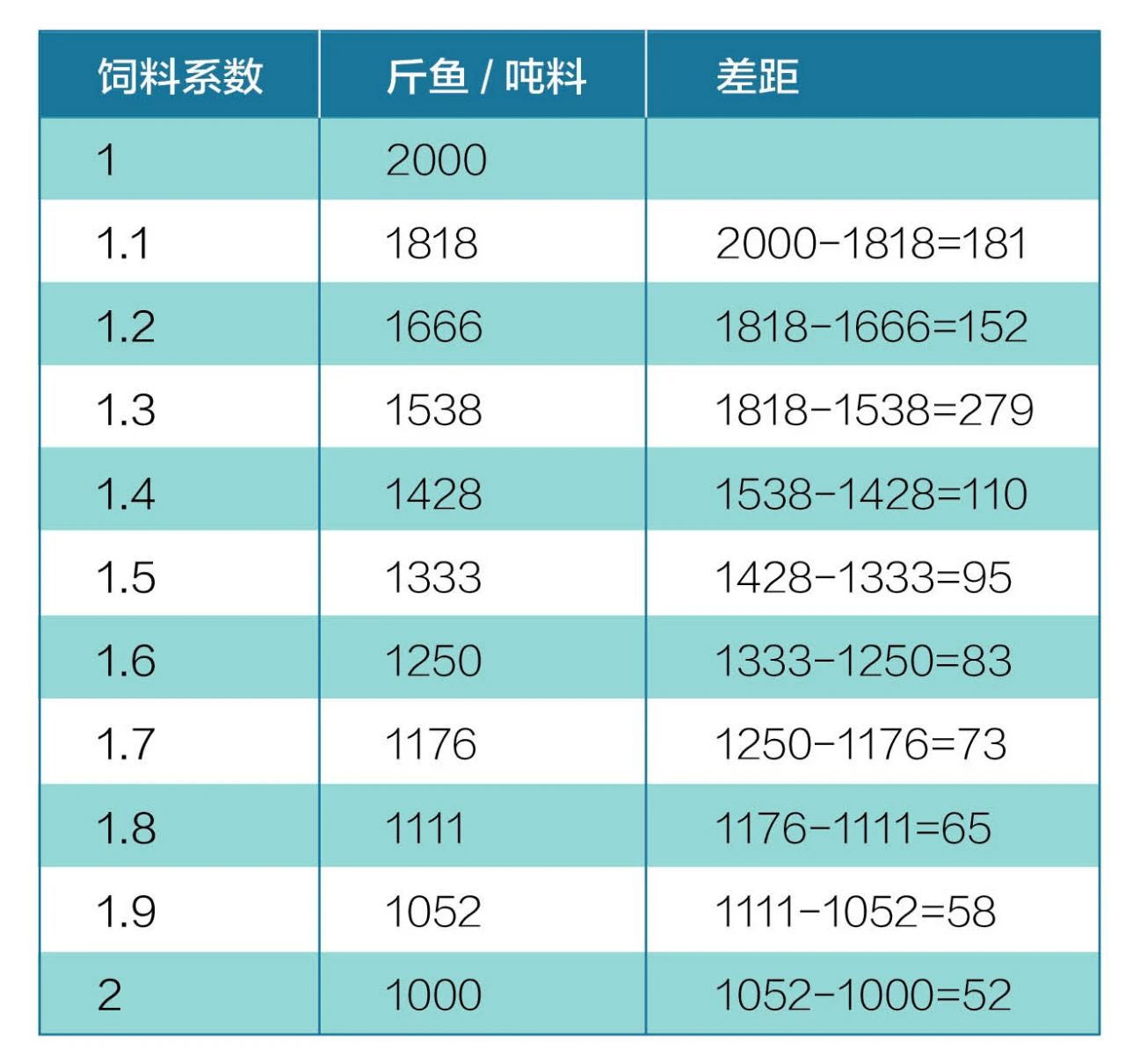 相同重量飼料,不同飼料系數(shù)情況下生產(chǎn)成魚(yú)產(chǎn)量也存在差距。從這個(gè)表可以看出,同樣的2000斤飼料,當(dāng)飼料系數(shù)為1時(shí),可以產(chǎn)出2000斤成魚(yú);但飼料系數(shù)增加到2時(shí),產(chǎn)出的魚(yú)只有1000斤。